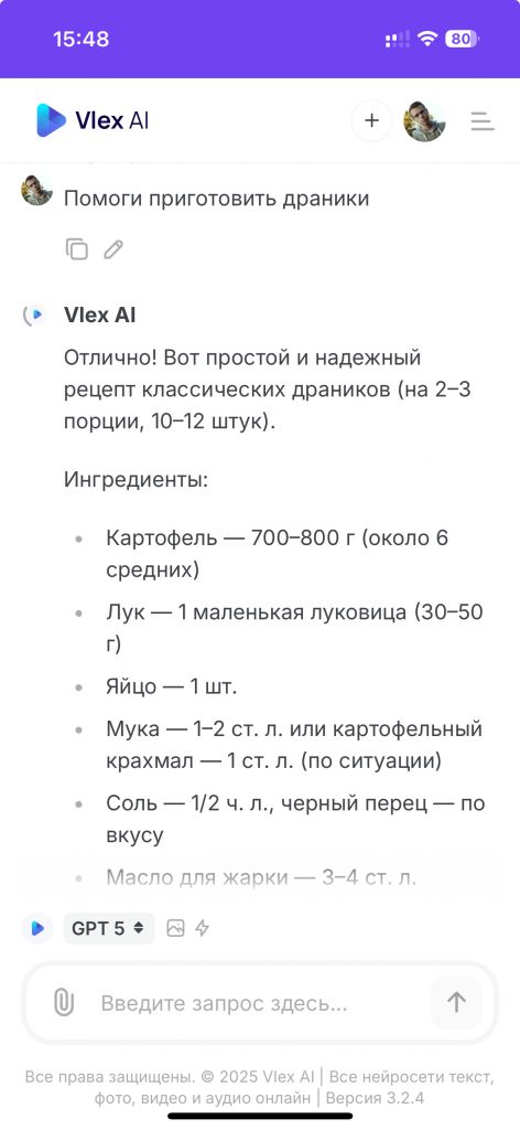 Получите доступ к ChatGPT 5, ChatGPT 4o и ChatGPT 4.1 в Vlex AI — без ограничений, без блокировок, на русском языке. Работает онлайн и в Telegram, без регистрации и сложных установок.